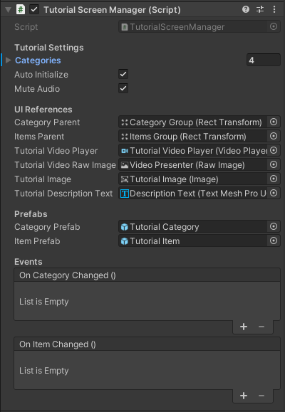 <figure><img src="https://365534536-files.gitbook.io/~/files/v0/b/gitbook-x-prod.appspot.com/o/spaces%2Fe3sbbo5VF7BduV4kMEFP%2Fuploads%2FdWPQbOr8QEoBQnn5rZov%2Fimage.png?alt=media&#x26;token=0ffa067d-e185-4c76-80b8-3dc89429f04a" alt=""><figcaption><p>The Tutorial Manager component in the inspector</p></figcaption></figure>